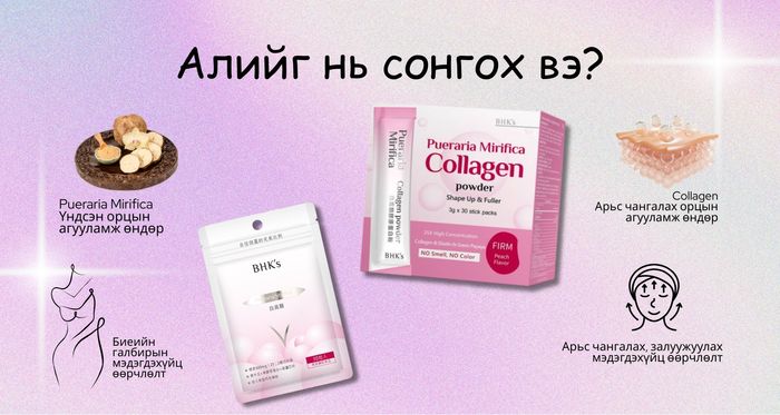BHK's брэндийн Pueraria Mirifica (Пуэрария Мирифика ургамал) агуулсан эдгээр хоёр бүтээгдэхүүн нь эмэгтэйчүүдийн гоо сайхан, бие галбирт зориулагдсан боловч найрлага болон үйлчилгээний чиглэлээрээ хэд хэдэн ялгаатай байдаг.Та өөрийн зорилгодоо тохируулан сонгоход туслах харьцуулалтыг доор хүргэж байна.Энэ 2 бүтээгдэхүүнд орсон Pueraria Mirifica гэж юу вэ?Тайландаас гаралтай ургамалФитоэстроген (ургамлын гаралтай эстроген төст бодис) агуулдагҮүнд:MiroestrolDeoxymiroestrolIsoflavones зэрэг бодисууд орноЭдгээр нь хүний биед байгаа эмэгтэй даавар эстрогентэй төстэй үйлдэл үзүүлэх чадвартай гэж үздэг.Pueraria Mirifica-гийн үйлдэл:Фитоэстроген нь бие дэх эстрогентэй төстэй рецепторт холбогдож:хөхний эдийн шингэн барилтыг нэмэгдүүлэхбулчирхайлаг эдийн идэвхжилд нөлөөлөхөөхөн эдийн хуримтлалд бага зэрэг нөлөөлөхзэргээр хөх илүү дүүрэн, бөөрөнхий харагдах мэдрэмж үүсгэдэг.1. BHK's Pueraria Mirifica Capsules (Үндсэн капсул)Энэхүү бүтээгдэхүүн нь голчлон дааврын тэнцвэрт байдал болон биеийн галбирт (ялангуяа цээж хэсгийн хөгжил) анхаарсан байдаг.Гол найрлага: Тайландын цагаан Пуэрария Мирифика ургамлын ханд.Үйлчилгээ: Уг ургамалд агуулагддаг фитоэстроген нь эмэгтэй хүний эстроген даавартай төстэй үйлчилгээ үзүүлдэг тул биеийн галбир засах, арьсыг зөөлөн булбарай болгоход тусалдаг.Хэнд тохиромжтой вэ: Биеийн ерөнхий галбирт анхаарах, хөх өгзөг томруулах, эмэгтэйлэг байдлыг дэмжих сонирхолтой хүмүүст илүү тохиромжтой. 2. BHK's Pueraria Mirifica + Collagen (Коллагентэй хувилбар)Энэ нь Пуэрария Мирификаг арьс арчилгааны хамгийн хүчтэй орц болох коллагентэй хослуулсан цогц бүтээгдэхүүн юм.Гол найрлага: Пуэрария Мирифика + Коллаген пептид Үйлчилгээ: Галбир засахаас гадна арьсны уян хатан чанарыг сайжруулах, үрчлээний эсрэг, арьсыг чангалах давхар үйлчилгээ үзүүлнэ. Коллагены шимэгдэлтийг дэмждэг бусад орцуудаар баяжуулсан.Хэнд тохиромжтой вэ: Галбиртаа анхаарахын зэрэгцээ арьсны сулралтыг засах, арьсаа залуужуулах хүсэлтэй хүмүүст нэн тохиромжтой.⚠️ Анхаарах зүйлс:Насны хязгаар: 20-оос доош насны охид болон хүүхэд хэрэглэхийг зөвлөдөггүй.Жирэмсэн ба хөхүүл: Жирэмсэн болон хөхүүл үед хэрэглэж болохгүй.Сарын тэмдэг: Сарын тэмдэг ирсэн үед хэрэглээгээ түр зогсоож, дууссаны дараа үргэлжлүүлэх нь зохимжтой байдаг (дааврын нөлөөлөлтэй холбоотой).Хэрэв та зөвхөн галбиртаа анхаармаар байвал үндсэн капсулыг, харин арьс тань сулрах хандлагатай эсвэл илүү цогц гоо сайхны үр дүн хүсэж байвал коллагентэйг нь сонгоорой.ДЭЭРХ 2 БҮТЭЭГДЭХҮҮН АЛЬ АЛЬ НЬ ЭСТРОГЕН ДААВАРТАЙ ИЖИЛ ҮЙЛЧИЛГЭЭ ҮЗҮҮЛДЭГ ТУЛ САРЫН ТЭМДЭГИЙН МӨЧЛӨГ АЛДАГДСАН ҮЕДЦЭВЭРШИЛТИЙН ШИНЖ ТЭМДЭГ ЭХЭЛСЭН ҮЕДХЭРЭГЛЭХЭД НЭН ТОХИРОМЖТОЙ.
